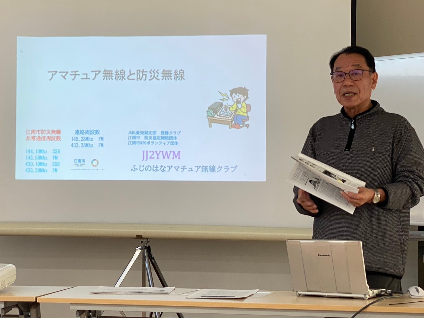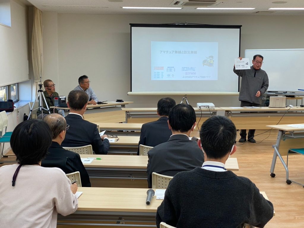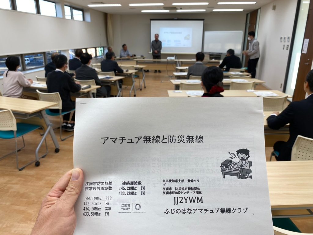 江南市とふじのはなアマチュア無線クラブは、2024年11月25日防災無線に関する勉強会を開催しました。江南市役所の危機管理室長、防災安全課長はじめ課員の皆様7名、江南市の市会議員の皆様にも5名参加いただきました。